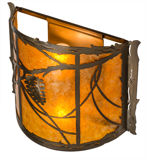 Listen closely. You can almost hear the soft whisper of the pine branches as they dance in the wind. Enjoy the warm ambiance of soft beautiful light diffused through Amber Mica, which is highlighted with stunning pinecone and pine branch designs. The hardware and decorative accents are featured in a handsome Antique Copper finish. This wall sconce is handcrafted by Meyda Artisans in Yorkville, New York at the foothills of the majestic Adirondack Mountains in the USA. Create the colors, size and style of your choice. Dimmable energy efficient lamping options are available. The sconce is UL and cUL listed for damp and dry locations.