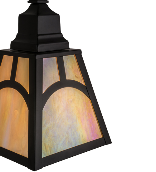 A clean look inspired by the Arts & Crafts movement, this Craftsman Signature pendant is custom crafted of Solid Brass. This abstract hilltop design is featured on Beige Iridescent art glass, which is enhanced by decorative accents and hardware finished in handsome Solar Black. Custom crafted by the hands of Meyda artisans in Yorkville, New York, this pendant is available in custom colors, styles and sizes available. Energy efficient lamping options are offered. This fixture is UL and cUL listed.