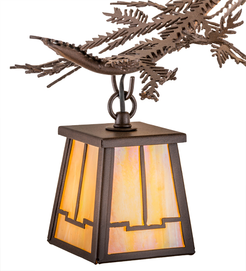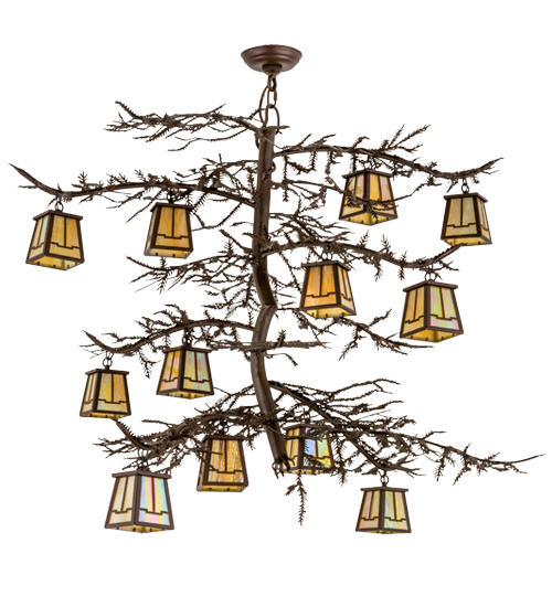 Invite the natural charm of the American woodlands into your camp, lodge, home or business with this chandelier.12 Beige Iridescent art glass lanterns offered in a stunning Arts & Crafts design, which adorn Pine Branch shaped arms accented with the pine needles of this unique nature inspired chandelier. This stunning elaborate fixture features hardware and decorative accents in a warm Care Noir finish. Handcrafted in our facility at the foothills of the Adirondack Mountains in the US, this chandelier is offered in custom sizes, designs and colors available, as well as dimmable, energy-efficient lamping options. UL and cUL listed for damp and dry locations.