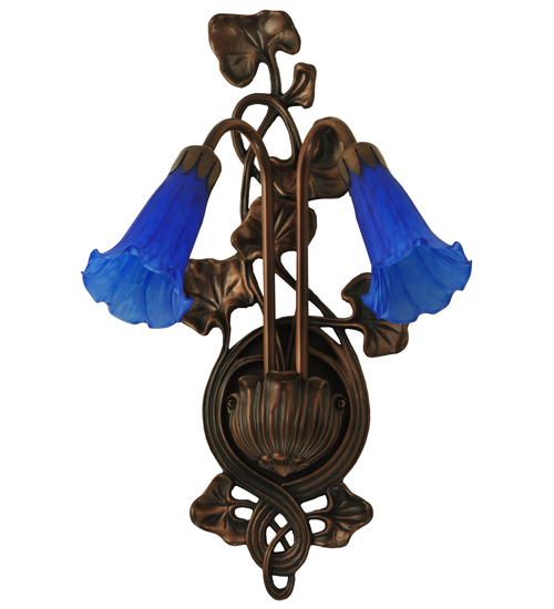 One of the most popular Louis Comfort Tiffany styled lamps on the market today, recreating his famous Favrile design from the early 1900's. This softly mottled Indigo Blue shaded Two Light Wall Sconce offers an attractive, delicate design featuring shades mouth blown of fine art glass. Lily shades are suspended from stems delicately winding above a Lily pads fixture finished by hand in Mahogany Bronze.