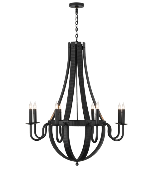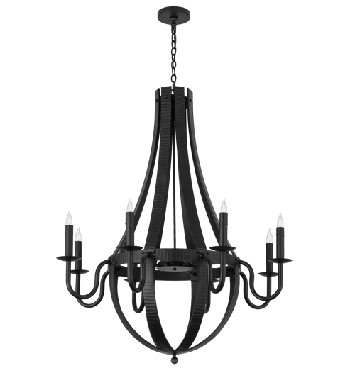 Rugged rustic charm blends with a distinctive, but charming beauty. Inspired by Antique Wooden staves traditionally bound by wooden or metal hoops in the construction of beer/whisky barrels and wine casks, Costello Black finished solid stout, curved steel arms support bobeches accented with faux candleholders which line up like soldiers at attention in abeyance of the barrel to which they serve. Ideal for lobbies, foyers, banquet rooms and reception areas, this unique chandelier is custom crafted by artisans in our 180,000 square foot manufacturing facility in Yorkville, New York. Options include custom colors, sizes, finishes and dimmable energy efficient lamping. UL and cUL listed for damp and dry locations.