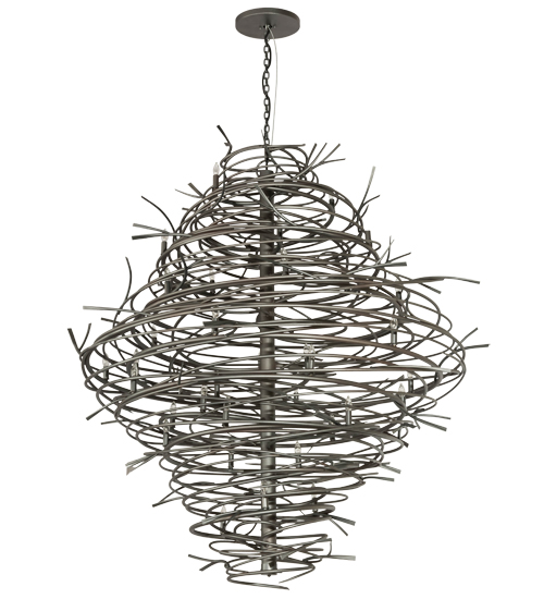 The bold, eye-catching Cyclone simulates whirling winds of energy and gyration with twisting steel that is accentuated with 36 delicately placed beacons to help you weather the storm. The winding mass of steel surrounds a sturdy post, all featured in our Pewter finish. Make an impressive design statement that will wow guests in lobbies, conference rooms, entryways and other residential and commercial spaces. The fixture is handcrafted by master artisans in our 180,000 square foot manufacturing facility in Yorkville, New York. Custom designs, styles, sizes and dimmable energy efficient lamping such as LEDs are available. This chandelier is UL and cUL listed for damp and dry locations.