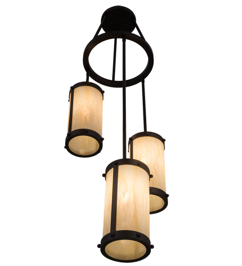 The Cartier Cascading Chandelier renders an eye-catching transitional look. 3 Stunning Sahara Taupe Idalight shades are aligned in a staggered formation, suspended from a decorative ring while providing ambient light at various levels. All hardware is featured in a Mahogany Bronze finish while a warm glow evokes from the decorative cylinders. Ideal for illuminating lobbies, foyers, and other spaces. Custom crafted in our 180,000-square-foot manufacturing facility in Yorkville, New York. Custom options include special sizes, styles, and finishes, and dimmable energy-efficient lamping options. UL and cUL listed for dry and damp locations.
