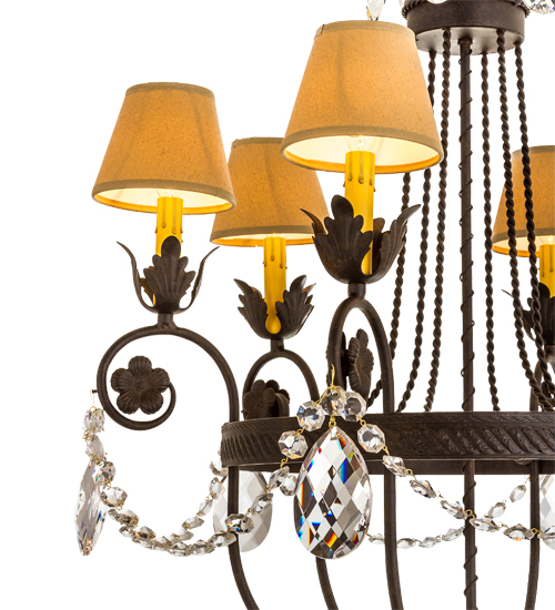 Exquisite styling and luxurious charm are reflected in these faceted crystal charms, scroll arms, Acanthus leaves and rich Chestnut finished hardware like a fine wooden paneled library. This elegant chandelier embraces six Amber faux candlelights topped with Tuscan Alabaster Textrene shades. This chandelier features quality materials and hand detailed American craftsmanship perfected by years of time-honored artistry and passed down from generations of prolific artisans. Custom sizes, styles, colors and dimmable energy efficient lamping options are available. The fixture is UL and cUL listed for damp and dry locations.