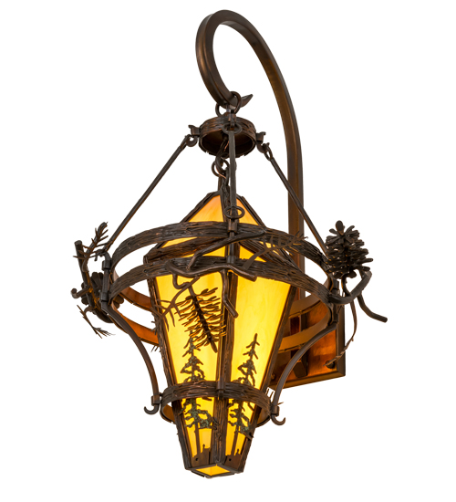 This Nature inspired lighting fixture features stunning Pinecones and Pine Branches that accenta stunning Tawnyrock Idalight shade which is enhanced with Tall Pine tree silhouettes. All decorative accents and hardware are featured in a Vintage Copper finish. The fixture is handcrafted by highly skilled artisans in the USA, at the foothills of the spectacular Adirondack Mountains. Custom sizes, styles and colors are available, as well as dimmable energy efficient lamping options such as LED. The 18-inch wide sconce is UL and cUL listed for damp and dry locations.