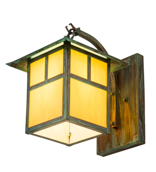 Custom crafted of Solid Brass, this Craftsman Signature lantern is inspired by the popular American Mission design movement. The Seneca sconce features a classic straight-line motif on a stunning Tawnyrock Idalight diffuser, which is complemented with hardware and decorative accents featured in a Verdigris finish. The striking wall fixture is perfect for a variety of indoor and outdoorapplications. The sconce is handmade by highly skilled artisans in our manufacturing facility in Yorkville, New York. Custom sizes, styles and colors are available, as well as energy efficient lamping options such as LED. The 9-inch wide fixture is UL and cUL listed for dry, damp and wet locations.