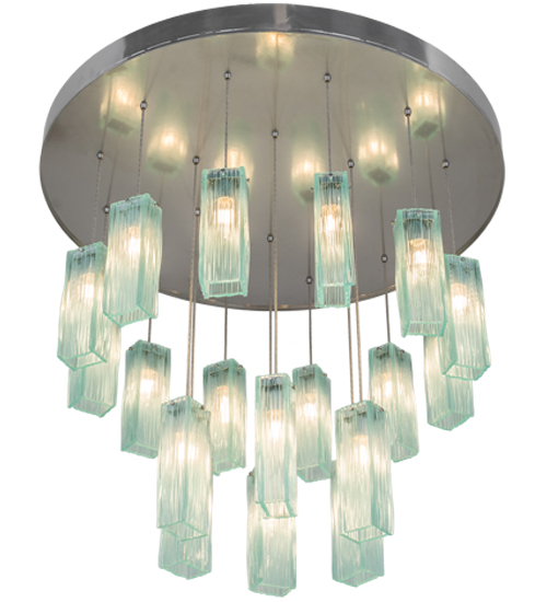 Contemporary, transitional, artistic, elegant and creative. Nothing compares to this stunning art piece, which features 18 shades highlighted with a fused glass design inspired by natural layered rock formations and featured in a Clear hue that appears to be Aquamarine due to the natural minerals inherent in the glass. This cascading pendant is complemented with hardware featured in an Extreme Chrome finish. We are showing it in this photo with 12 rectangular styled shades featured at the top level while the remaining six diffusers are shown on the lower level. Each shade includes 13 feet of braided cord which can be suspended in any combinations of lengths to meet your exact specifications. This pendant is perfect for illuminatin entryways, foyers, conference rooms, lobbies and other rooms in residential, commercial and hospitality settings. Endless custom color, design and size options, as well as dimmable energy efficient lamping, are available. This pendant is featured in our American designed collection. UL and cUL listed for damp locations.