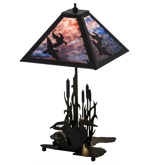 Ducks are soaring into the sky in this wildlife inspired original table lamp. Beautiful ambient lighting is projected through an Purple Blue art glass shade. The shade is enhanced with a Textured Black finished table base featuring a Duck swimming among the marsh and Cattails. This lamp is offered with a 3-section switch so the shade can be illuminated, the base can be lit as a night light, or both can be illuminated together. Handcrafted by highly skilled artisans in our 180,000 square foot manufacturing facility in Yorkville, New York, located at the foothills of the Adirondack Mountains. Wildlife and other custom designs are available. UL and cUL listed for dry locations.