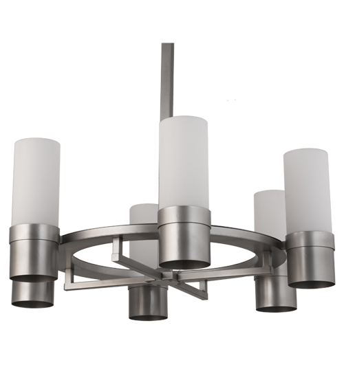 Designed with clean sophisticated styling, this distinctive lighting centerpiece will enhance both formal and casual interior settings. Six Statuario Idalight Cylindres, each with a customer-supplied, medium base lamp for ambient uplighting and another for functional downlighting, embrace the round crosshatch frame in a clean architectural Nickel finish. Perfect for lobbies, conference rooms, foyers and large spaces, the chandelier is handcrafted by highly skilled artisans in our 180,000 square foot manufacturing facility in Yorkville, New York. Custom styles, colors, sizes and dimmable energy efficient lamping options such as LED are available. The fixture is UL and cUL listed for damp and dry locations.