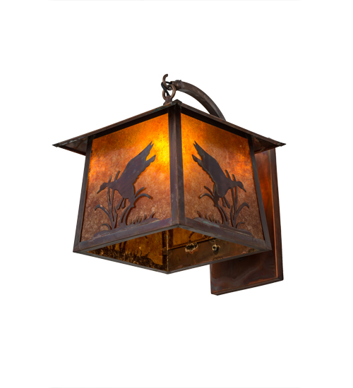 Ducks fly about the cattails and marsh grasses in this wildlife inspired original lighting fixture. Beautiful ambient lighting is emitted through stunning Amber Mica with a Solid Brass frame and hardware featured in a Vintage Copper finish. This Craftsman Signature sconce is ideal for illuminating hallways and a variety of other rooms in residential and commercial settings including man caves, trophy rooms, outdoor retailers, sports shops and other locations. The wall lantern is handcrafted in the USA by Meyda artisans in the Yorkville, NY manufacturing facility at the foothills of the glorious Adirondack Mountains. Wildlife and other custom designs are available. Energy efficient lamping and custom size options are offered. This sconce is UL and cUL listed for wet and dry locations.