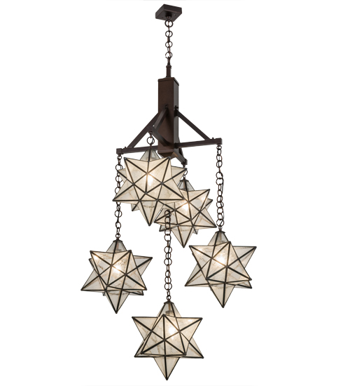 Like wishing upon a magical star in the sky, this unique Moravian Star Chandelier is inspired by star lights that were originally believed to bring good luck to European homes hundreds of years ago. This unique fixture features 5 Star diffusers, each with a dozen points of light handcrafted with Clear Seeded Glass. Custom crafted by Meyda artisans in the USA, this chandelier is enhanced with a frame, accents and hardware featured in an Mahogany Bronze finish. Custom sizes, styles, colors and dimmable energy efficient lamping options such as LED are available. The fixture is UL and cUL listed for damp and dry locations.