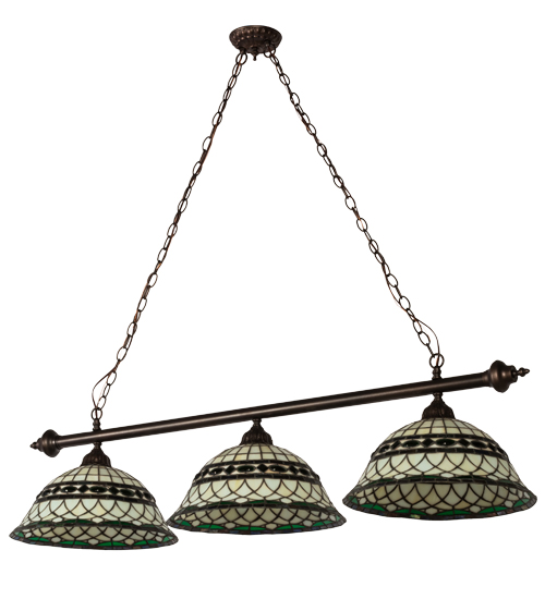 Emerald-colored jewels and Multi colored granite glass accentuate this elegant Amber Beige art glass reproduction of a famous Louis Comfort Tiffany design. This Roman styled shade is inspired by Italian art and architecture and handcrafted of authentic stained glass using Meyda Tiffany's famous copperfoil construction method. Hand forged decorative hardware, which is featured in a hand applied Mahogany Bronze finish, embraces these stunning shades. The pendant is ideal for illuminating islands, billiard tables, counters, bars and other locations. Custom colors, styles and sizes are offered, as well as dimmable energy efficient lamping options. The fixture is UL and cUL listed for damp and dry locations.