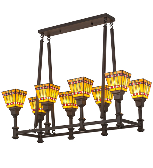 Utilizing a love for geometric forms, this prairie styled design interprets organic objects into simplified lines with eight art glass shades designed with rows of Chili Red and Wheat kernels and stalks of Bronzed Jade against a Maize Gold background. The famous Meyda Tiffany famous copperfoil construction process is used to create the shades, which are paired with hardware featured in a Cafe Noir finish. Perfect for display over islands, billiard tables, counters and other tabletops and surfaces. Custom colors, styles and sizes are available, as well as dimmable energy efficient lamping options such as LED. UL and cUL listed for damp and dry locations.