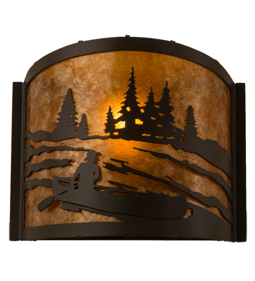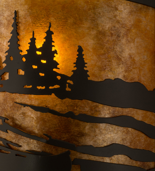 A visually appealing design that depicts the calm of nature as a sportsman paddles his canoe down a gentle mountain stream. This curvaceous wall fixture features an Amber Mica shade enhanced with a frame and decorative accents in a stunning Timeless Bronze finish. The fixture is ideal for beautiful ambient illumination on a wall in nearly any residential or hospitality location. The Canoe at Lake Wall Sconce is included in our American-made, American-designed, handcrafted Sporting Life Collection. Manufactured in Yorkville, New York. UL and cUL listed for dry and damp locations.