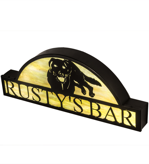 A stunning illuminated Personalized Sign features Rusty's Bar brand name and logo artwork in a Timeless Bronze finish against brilliant Beige Iridescent art glass.This sign, highlighted with a crescent shaped crown, is illuminated with integral LEDs for energy savings, reduced maintenance and long lamp life.Handcrafted by Meyda artisans in Yorkville, New York manufacturing facility, this lighted sign is available in custom colors, sizes, styles and dimmable energy efficient options.UL and cUL listed. Personalized items are shown as examples of our craftsmanship only and not for sale 'as is,' but can be customized to fit your personal needs.