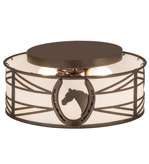 A horse portrait framed with a lucky horseshoe encircles this handsome ceiling fixture. Beautiful ambient light projects through stunning Statuario Idalight accented by a geometric design styled after fencing commonly found at horse stables.Decorative hardware, frame and accents are enhanced in an Antique Copper finish.Perfect for game rooms, man caves and equine/equestrian related businesses.Handcrafted by Meyda artisans in the USA.Custom sizes, styles and colors are available. Energy efficient lamping options such as LED are offered.This fixture is UL and cUL listed for damp and dry locations.
