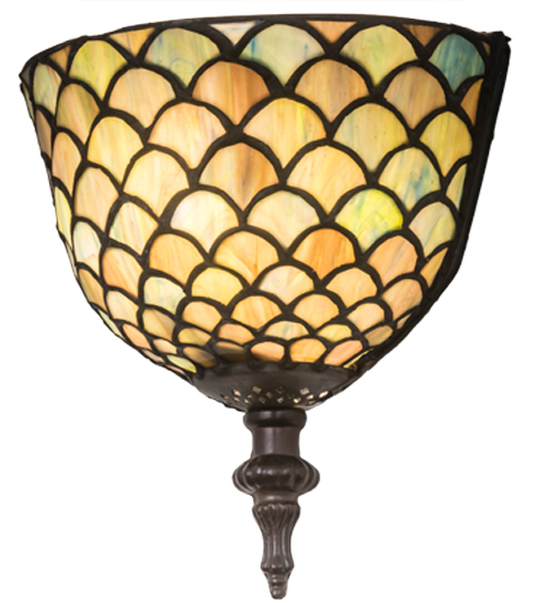 A Louis Comfort Tiffany studio classic, the classic Fishscale pattern is reproduced in variegated art glass of Honey dripped Emerald, Sapphire, and Garnet, evoking a unique dimensional and textured look in a rainbow of brilliant hues.This exquisite art glass shade, which is created using Meyda Tiffany's famous copperfoil construction process, is complemented with Mahogany Bronze hand finished hardware.The wall fixture will complement nearly any color or style of interiors. Custom sizes and styles are available, as well as dimmable energy efficient lamping options such as LED.This sconce is UL and cUL listed for damp and dry locations.