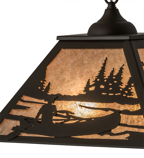 A visually appealing design that depicts the calm of nature as a sportsman paddles his canoe down a gentle mountain stream. The ceiling pendant features a Silver Mica shade enhanced with a frame and decorative accents in a stunning Oil Rubbed Bronze finish. The ceiling pendant is ideal for beautiful ambient illumination above a table or island in your home, lodge, restaurant, or business. The Canoe at Lake Pendant is included in our American-made, American-designed, handcrafted Sporting Life Collection. Manufactured in Yorkville, New York. UL and cUL listed for dry and damp locations.