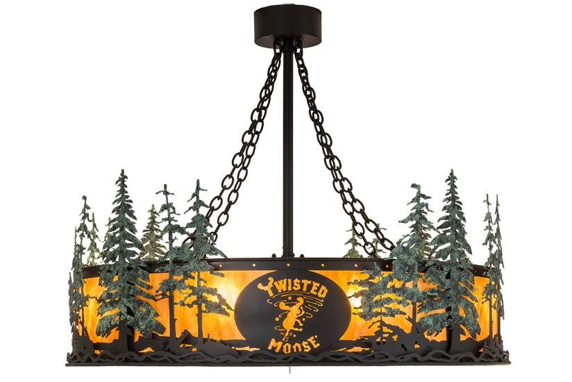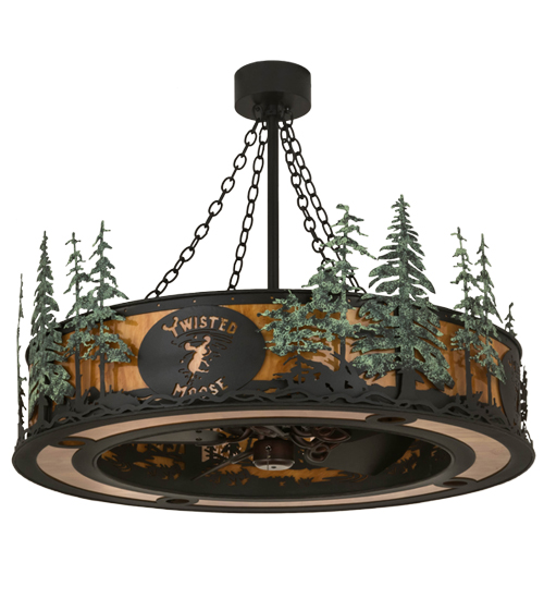 A fan-tastic decorating idea, this innovative Chandel-Air combines a custom luminaire with energy-efficient fan technology. The stunning Ambra Siena Idalight diffuser is highlighted with Green handpainted pine trees and the Twisted Moose Sports Grill name and logo. Hardware is featured in Black Textured finish. 8 inner lights bring out the beauty of the Idalight while 4 downlights deliver task illumination. Handcrafted in the USA, this energy saving Fan Integrated Light Fixture pulls hot air up and keeps the space cool in the summer, and reversed in the winter to push down hot air and maintain warmth. Personalized items shown as examples of our craftsmanship only and not for sale as is but can be customized to fit your personal needs.