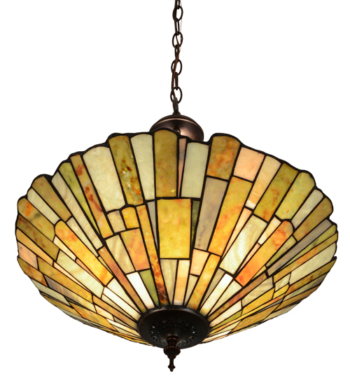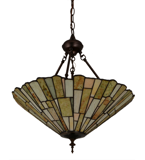 Thinly hand carved and polished natural Jadestone in earthy tones of Moss Green, Beige, Honey, Natural Ivory and Coral become luminescent in this unique tile patterned pendant. The natural stone inverted shade is crafted using the famous Meyda copperfoil construction process that creates Tiffany stained glass lamps and fixtures. Pendant hardware is featured in a handsome Mahogany Bronze finish. Ideal for placement over a kitchen island, counter or dining table. The Delta Jadestone Pendant is featured in our American made, American designed handcrafted Jadestone Lighting Collection. Manufactured in Yorkville, New York. UL and cUL listed for dry and damp locations.