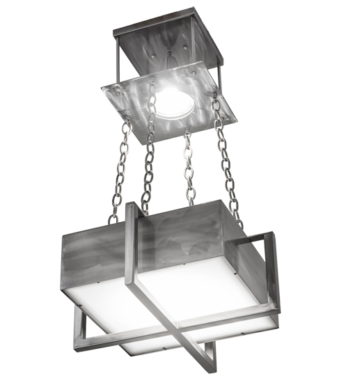 Created with a stunning architectural look combined with edgy industrial styling, this cube-shaped pendant design features a Natural finished steel frame embraced by a sturdy crossbar structure. The fixture frame embraces a Statuario Idalight lens which diffuses illumination projected from a 60-watt downlight above. The downlight is mounted to the ceiling canopy and suspends the fixture with a heavy chain. Custom crafted and tightly engineered in our 180,000 square foot manufacturing facility in Yorkville, New York this pendant is available in custom sizes, styles, colors and dimmable energy efficient lamping options such as LED. The fixture is UL and cUL listed for damp and dry locations.