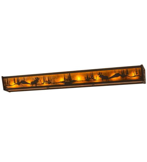 Wandering among the wilderness lakeside, the majestic Moose with antlers stands tall as he adorns this luminaire, which features a long linear Amber Mica lens. The diffuser is complemented with hardware and decorative accents featured in an Oil Rubbed Bronze finish. This fixture is perfect for illuminating a vanity in a fine bath or a corridor or other room in a hotel, restaurant or home. Handcrafted at the foothills of the Adirondack Mountains where the term vacation is said to have originated by wealthy New Yorkers who would vacate the City during the sticky summer months and head for the cool northern woods. Custom options available. UL and cUL listed.