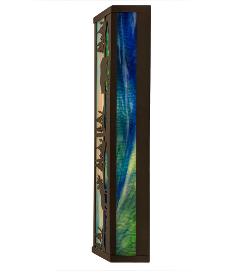 Wandering among the stunning Blue Green art glass lake, the majestic Moose with antlers stands tall as the sun sets against a Blue, Green and Mauve art glass sky. This linear diffuser is complemented with a frame, hardware and decorative accents featured in a Timeless Bronze finish. This fixture is perfect for illuminating a vanity in a fine bath or a corridor or other room in a hotel, restaurant or home. Handcrafted at the foothills of the Adirondack Mountains, this luminaire is available in custom sizes, finishes and colors, as well as dimmable energy efficient lamping options such as LED. The fixture is UL and cUL listed for damp and dry locations.
