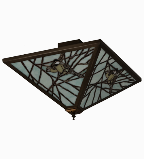 Bark Brown and Golden Ripple Glass branches across a Celadon sky make a pleasant repose for these birds that are often seen in the backyard.A Meyda original design, the shade is created using the famous Meyda Tiffany copperfoil construction process. The frame and hardware are featured in an Antique Copper finish.Custom colors, designs and sizes are available, as well as dimmable energy-efficient lamping such as LED. The fixture is UL and cUL listed for damp and dry locations.