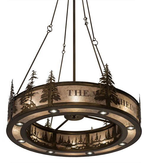 This Craftsman-styled Pendant is personalized with the name, The Waldheim, featured in a handsome Antique Copper finish, and adorned with ten complementary Pine Tree silhouetted figures. Soft ambient light is diffused beautifully through the Silver Mica lens. The prominent fixture is perfect for installation in dining areas and entryways. Sixteen inner lights provide uplighting and highlight the beauty of the mica, while eight downlights deliver functional lighting below. The decorative lamps, uplights, and downlights benefit from separate circuits to give you precise dimming control over the various layers of light. The Personalized Waldheim Inverted Pendant is included in our American-made, American-designed, handcrafted Personalized Collection and manufactured in Yorkville, New York. The fixture is UL and cUL listed for dry, damp and wet locations. This lighting fixture can be ordered by calling us and adding your business logo or family name for your next project. Please call for pricing and lead time.
