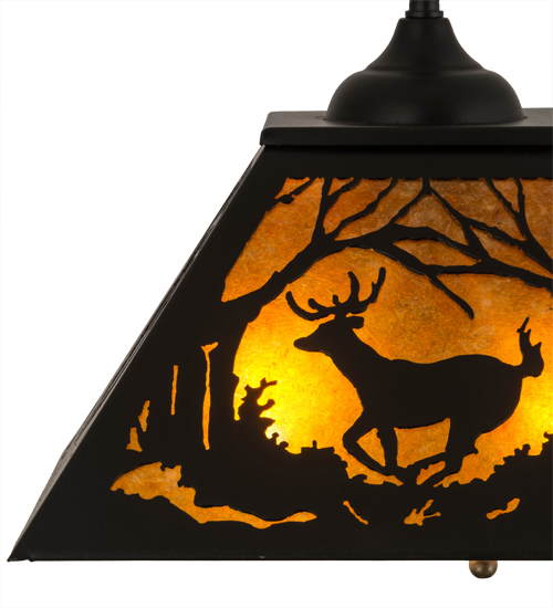 Bring the Great Outdoors inside with this nature inspired pendant, which depicts a graceful Deer scampering through the woods as the sun rises in the background. The shade features stunning Amber Mica which is enhanced with decorative accents and a frame offered in a Textured Black finish. The fixture is handcrafted in our manufacturing facility at the foothills of the Adirondack Mountains in the USA. Custom designs, sizes, colors and dimmable energy efficient lamping options such as LED are available. This ceiling pendant is UL and cUL listed.
