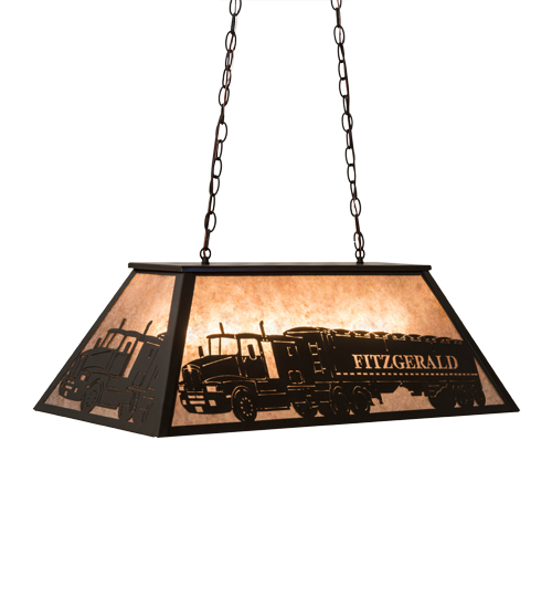 Offering a stunning Silver Mica design, this beautiful oblong pendant features the FITZGERALD name in Silver Mica on a Timeless Bronze finished graphic of a trailer truck. The overall height ranges from 20.5 to 48 inches, as the suspension chain can be easily adjusted in the field to meet your lighting requirements. The oblong pendant is ideal for illuminating billiard tables, bars, islands, counters, and dining tables in residential and hospitality locations. The overall height ranges from 20.5 to 48 inches, as the suspension chain can be easily adjusted in the field to meet your lighting requirements. The Personalized Fitzgerald Oblong Pendant is included in our American-designed, handcrafted Personalized Lighting Collection and manufactured in Yorkville, New York. UL and cUL listed for dry and damp locations. This specific pendant can be ordered, and we will coordinate the custom logo with you to suit your project. Please call for the price and lead time.