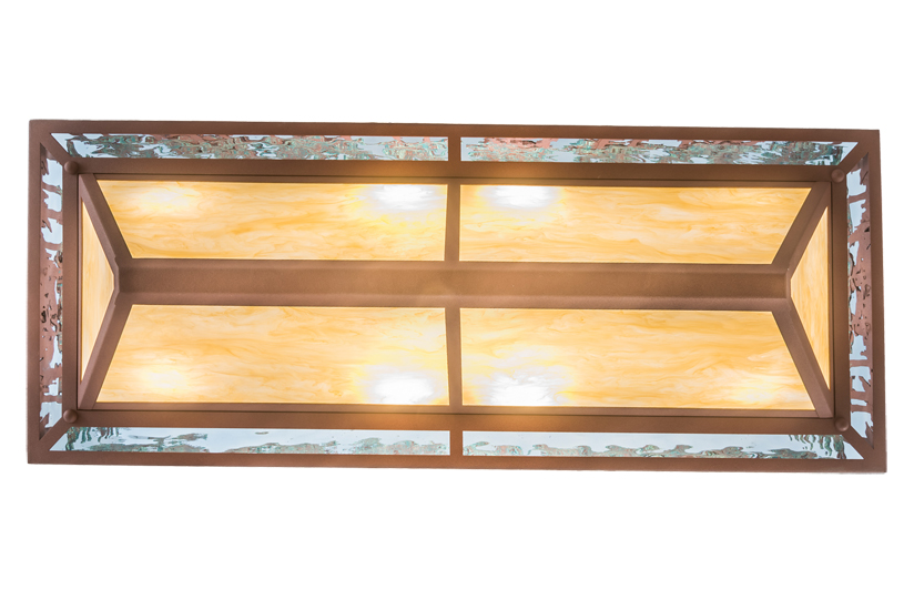 An inspiring stand of Green Handpainted Tall Pine tree silhouettes appear to grow above a Botticino Idalight inverted shade. The Blue Art Glass border represents Pine Lake on this inverted pendant which is enhanced with a stunning Rust finish. The rectangular canopy is embraced by large cylinder posts custom mounted into a log above and wired directly into a J-Box. Contact us for the perfect custom lighting solution for your fixture mounting challenges. The Pine Lake Oblong Pendant is Domestically Produced in the USA at our Yorkville, NY manufacturing facility. Customize shade colors, sizes and metal finishes to satisfy your taste. UL and cUL listed for damp & dry locations.