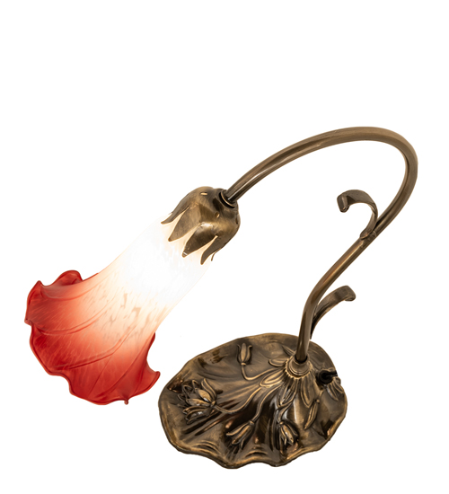 Inspired by the famous Tiffany design from the early 1900s... This mini lamp features a stunning Red and White art glass shade that is embraced by an elegant cast base finished by hand in Antique Brass. The Pond Lily Mini Lamp is included in our American designed, handcrafted Favrile Glass Lighting Collection. UL and cUL listed for dry locations. Each shade is a unique work of art with color variations based on natural ingredients inherent in the glass. Contact us if color matching is critical when ordering multiple items.