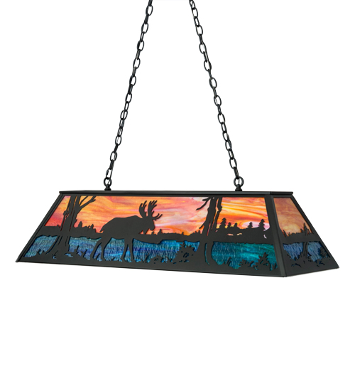 A majestic Moose meanders alongside a woodland lake as the brilliant morning sun rises at dawn. This pendant highlights an image that is perfect for picture postcards and great works of art. Eye-catching Sunburst colored art glass depicts the sky as Blue-Green art glass represents the woodland lake. This oblong pendant features decorative accents and hardware in a Textured Black finish. Perfect for illuminating kitchen islands, dinettes, islands, billiard tables, counters and bars. Custom crafted by highly skilled artisans at the foothills of the spectacular Adirondack Mountains in Upstate New York. Custom sizes, styles and colors available. Dimmable energy efficient lamping options offered. UL and cUL listed for dry and damp locations.