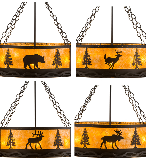 Charming wildlife creatures come to light with this magnificent design. A scampering Deer, a meandering Bear, an Elk and a Wolf are all shown roaming among Tall Pine Trees as the late afternoon sun sets in the background. Beautiful ambient light shines through Amber Mica while the curvaceous shade is enhanced with a Textured Black finish. Domestically produced in our 180,000 square foot manufacturing facility in Yorkville, NY. Customize shade colors, metal finishes and fixture sizes to your taste. UL and cUL listed for dry and damp locations.