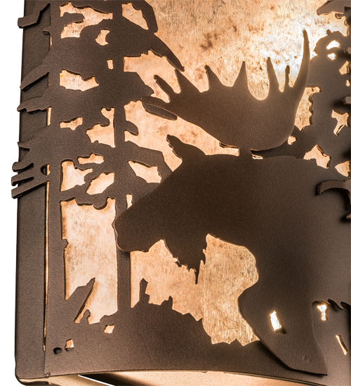 A Moose wanders through the Tall Pine trees across the woods on this stunning curvaceous wall sconce. This wall fixture is featured in Silver Mica which is enhanced with decorative accents and hardware in a warm Mahogany Bronze finish. Handcrafted in the Meyda manufacturing facility at the foothills of Central New York's breathtaking Adirondack Mountains. Custom colors, styles and sizes are available. Dimmable energy efficient options such as LED are offered. The 12-inch wide sconce is UL and cUL Listed for dry and damp locations.