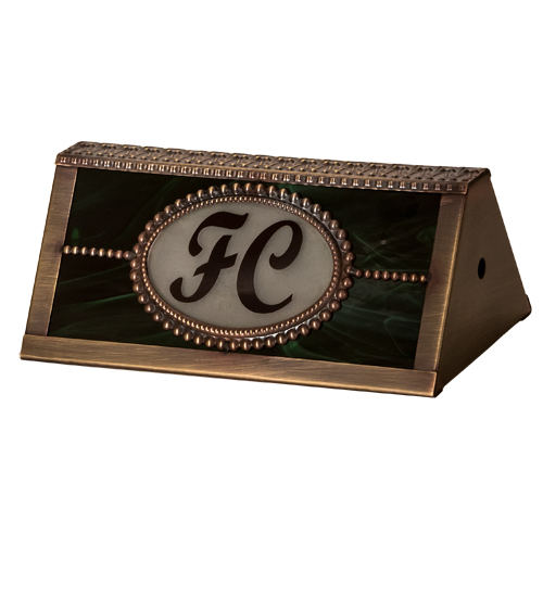 A stunning Brass Banker's Lamp shade is personalized with the FC logo in a Red hue on a Clear Glass background. The shade features Emerald Green art glass and is complemented with an Antique Brass finish. The shade pairs well with a base to create the perfect banker's lamp. The Personalized FC Banker's Shade is included in our American-made, American-designed, handcrafted Personalized Banker's Lamp Collection and manufactured in Yorkville, New York. This specific shade can be ordered, and we will coordinate the custom logo with you to suit your project. Call For Lead Time and Pricing.