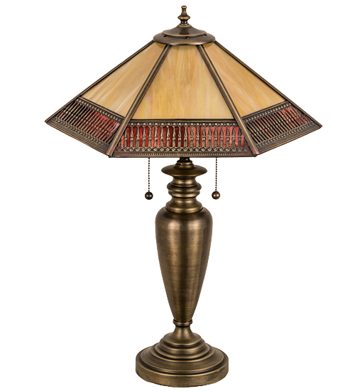 Embrace the timeless look of this classic art glass lamp design. The Brass lamp features a Beige Glass shade complemented with Burgundy Art Glass trim. The shade is complemented with a Mahogany Bronze finished base. The table lamp is a part of our American made, American designed handcrafted Gothic lighting collection. Manufactured in Yorkville, New York. UL and cUL listed for dry locations.
