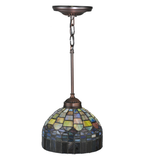 In the early 20th century, Tiffany Studios used its artful mastery to develop the look of a woven fabric with a fringed skirt from art glass. Meyda Tiffany has recreated this shade with Amber Plum glass fringe suspended from a domed brickwork of Emerald, Cobalt, and Ruby-tinted Honey glass. Hand-cut and copper-foiled glass pieces comprise this stately mini pendant, featuring a Mahogany Bronze finish. The overall height can be adjusted by combining the four stem lengths that are included: 6-inch, 12-inch, 16-inch, and 24-inch, in any combination to achieve the desired drop from the ceiling. The Tiffany Candice Mini Pendant is included in our American-designed, handcrafted Tiffany Reproduction Lighting Collection. It is UL and cUL listed for dry and damp locations. Each shade is a unique work of art with color variations based on natural ingredients inherent in the glass.