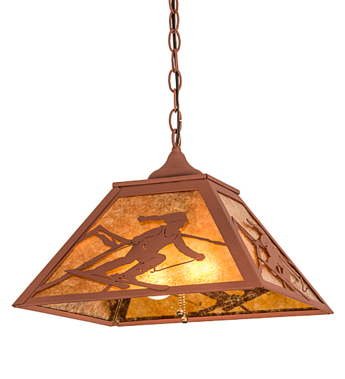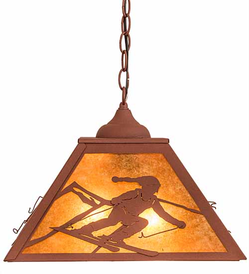 Skiers gliding down various trails on the slopes are featured in this compelling art glass design, which features ambient lighting diffused beautifully through an Amber Mica lens. This ceiling pendant is enhanced by a frame and hardware featuring a Rust finish. The fixture is perfect for illuminating corridors and dining areas in residential, restaurant, and lodge settings. The fixture is handcrafted in our manufacturing facility in the foothills of the Adirondack Mountains, not far from Lake Placid, New York, home of the 1932 and 1980 Winter Olympics. The overall height ranges from 15 to 45 inches as the chain easily adjusts in the field to meet your specifications. The Alpine Pendant is included in our American-made, American-designed, handcrafted Alpine Lighting Collection and manufactured in Yorkville, New York. UL and cUL listed for dry and damp locations.