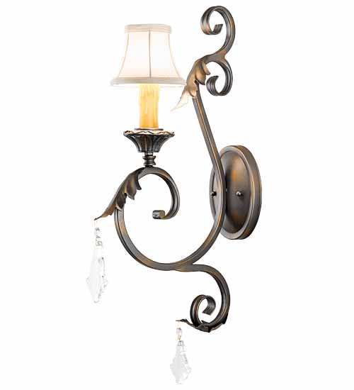 Offering a luxurious charm and elegance, Josephine features an elaborate design with Hand-Forged Iron scrollwork and accents in a stunning French Bronze finish. The exquisite sconce reveals an Amber faux candlelight crowned with a Cream Textrene shade and perched on a bobeche. The wall fixture is adorned with metal acanthus leaves and crystal pendalogues. Custom crafted by highly skilled artisans in our 180,000 square foot manufacturing facility in Yorkville, New York. Custom sizes, shade colors and metal finishes available. UL and cUL listed for dry and damp locations however we do not recommend installing it in spaces that experience a large amount of moisture due to the fabric shade.
