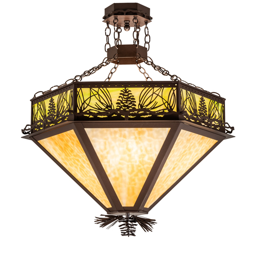 This handsome Pine Cone and needle patterned hexagonal inverted pendant with pine branch accents is suspended from chains and illuminated through Pine Green art glass panels which Beige art glass panels and a pinecone and needle accent. The pendant is finished in Cafe Noir and is handcrafted in the USA by Meyda artisans.