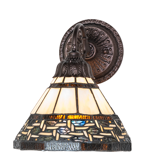 Named for the Greek word for light, Ilona will stir conversations among family and friends with a dramatic Honey and Beige colored knotwork design on Wispy Blue/Green Rippled glass. The background includes Beige, Mauve, and Purple art glass while Root Brown colored glass borders enhance the beauty of this exquisite art glass shade, which is created using the famous Meyda Tiffany copperfoil construction process. The wall fixture is complemented with hardware hand-finished in a warm Mahogany Bronze. To make a dramatic design statement, install this wall sconce in groups across corridors in residential, commercial, and hospitality settings from Pembroke, North Carolina, to Columbus, Ohio, to Minnetonka, Minnesota. The Ilona Wall Sconce is included in our American-designed, handcrafted Stained Glass Collection. UL and cUL listed for dry and damp locations. Each shade is a unique work of art with color variations based on natural ingredients inherent in the glass.