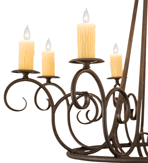 A symphony of scrollwork embraces graceful round bobeches that behold 8 Ivory faux candlelights which render beautiful ambient lighting. Hand-forged Copper Rust finished decorative accents and hardware create lovely charm and visual interest. The overall height ranges from 42 to 90 inches as the chain length can be easily adjusted in the field to accommodate your specific lighting application needs. Handcrafted by highly skilled artisans in our 180,000 square manufacturing facility in Yorkville, New York. Candlelight colors, metal finishes and sizes can be customized. UL and cUL listed for dry and damp locations.