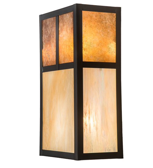 Handcrafted from Solid Brass, this Craftsman Signature fixture is inspired by the Arts and Crafts movement. The striking Mission straight line design is featured in Beige Iridescent art glass with Amber Mica accents and enhanced with a frame and hardware finished in a handsome Craftsman Brown. Handcrafted by highly skilled artisans in our 180,000 square foot manufacturing facility in Upstate NY. Custom sizes, styles, colors and dimmable energy efficient lamping options are available. The 6.5-inch wide wall fixture is UL and cUL listed for dry and damp locations.