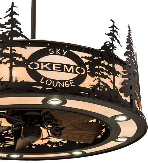 A fan-tastic, energy efficient decorating idea, this Chandel-Air combines custom lighting with energy-efficient fan technology. Fleshtone Idalight diffuser is highlighted with Tall Pine Tree silhouettes and OKEMO SKY LOUNGE name and logo, with Oil Rubbed Bronze finished hardware. 8 Customer supplied medium base inner lights bring out the beauty of Idalight, 8 Customer supplied downlights deliver task illumination, & 8 Customer supplied uplights provide ambiance, on 3 circuits for layered lighting. Handcrafted in Yorkville, NY, this Chandel-Air pulls hot air up & keeps the space cool in summer, and reversed in the winter to push down hot air and maintain warmth. This exact fixture is not for sale but can be personalized with your name or logo.
