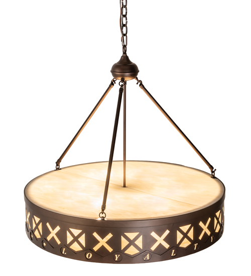 This handsome pendant features Sahara Taupe Idalight diffusers below and above the frame, personalized with an X design around the perimeter and the term LOYALTY. The ceiling fixture features a warm Mahogany Bronze finish. The overall height ranges from 31 to 111 inches, as the chain can be easily adjusted to meet your lighting requirements. The Personalized Hamilton Pendant is included in our American-made, American-designed, handcrafted Personalized Lighting Collection and manufactured in Yorkville, New York. The fixture is UL and cUL are listed for dry locations. This specific pendant can be ordered, and we will coordinate the custom logo with you to suit your project. Please call for price & lead time.