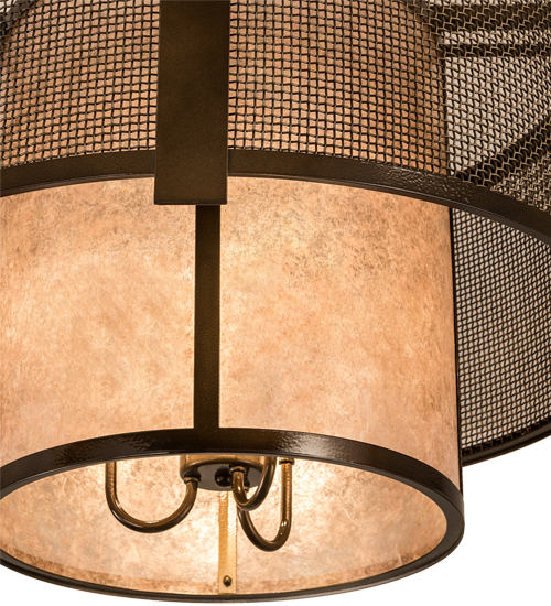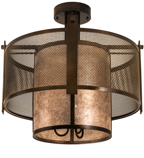 Designed with a cylindrical profile and a captivating look, this ceiling fixture features a distinctive aesthetic. The Weave-Tex Cage shade reveals a Silver Mica diffuser with a frame and hardware featured in an Antique Hammered Gold. Handcrafted by highly skilled artisans in our 180,000 square manufacturing facility in Yorkville, NY, this fixture is available in custom colors, styles, and sizes, as well as dimmable energy efficient lamping options such as LED. The 30-inch wide ceiling fixture is UL and cUL listed for damp and dry locations.