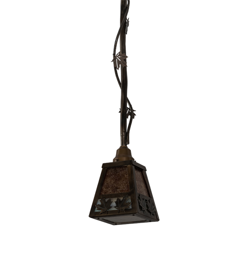 Delicately etched Maple Leaves appear to grow on Maple tree branches that adorn this pendant. The Amber Mica shade features Greenish Brown accents that are complemented with a Clear Frosted Glass bottom diffuser and a Light Burnished Antique Copper finish. In addition, a metal vine with Maple Leaves wraps around the suspension rod. For a powerful design statement, hanging several mini pendants above an island, bar, counter or table. The Maple Leaf Mini Pendant is featured in our American made, American designed handcrafted Rustic Lighting Collection. Manufactured in Yorkville, NY. UL and cUL listed for dry and damp locations.