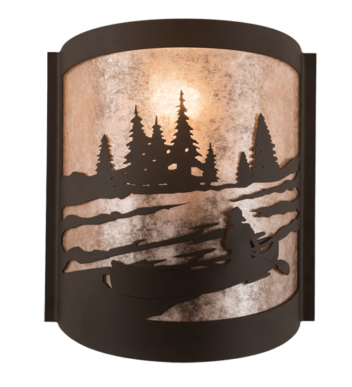 This nature inspired design depicts a sportsman paddling his canoe down a gentle mountain stream with a beautiful sunlit sky in the background. The ADA Compliant wall fixture is handcrafted with stunning Silver Mica which is enhanced with metal hardware and decorative accents that feature a warm Oil Rubbed Bronze finish. Ideal for hallways, foyers and any room where you want to make a charming rustic design statement. This right-side sconce pairs beautifully with 200794, a matching wall sconce for the left side of your space. The Canoe at Lake Wall Sconce is Domestically manufactured in our 180,000 square foot facility in Yorkville, NY. Customize diffuser colors, metal finishes and fixture sizes. UL and cUL listed for dry & damp locations.